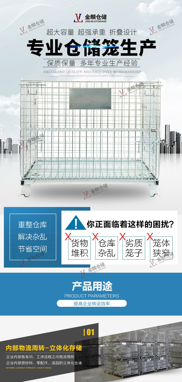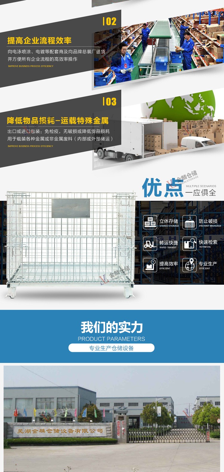 詳情折疊式倉儲籠,具有存放物品容量固定、堆放整潔、存放一目了然、便于庫存清點(diǎn)等優(yōu)點(diǎn),同時(shí)也提高了倉儲空間的有效利用率。此外,該產(chǎn)品堅(jiān)固耐用、運(yùn)輸便捷、能重復(fù)使用,能有效降低倉儲企業(yè)的人力消耗及包裝成本。隨...